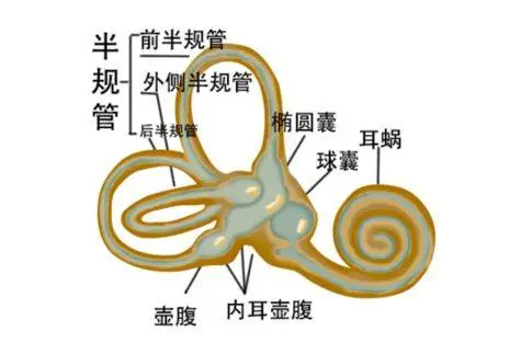 前庭平衡的生理器官在內耳,名叫半規管。半規管是維持姿勢和平衡有關的內耳感受裝置,包括橢圓囊,球囊和三對半規管(前管,后管,外管),控制人的身體平衡。(當機體進行旋轉或直線變速運動時,速度的變化(包括正,負加速度)會刺激三對半規管或橢圓囊中的感受細胞)。在球囊,橢圓囊結構內有感受重心變化的碳酸鈣鹽結晶體,形狀像石頭,故稱為耳石。