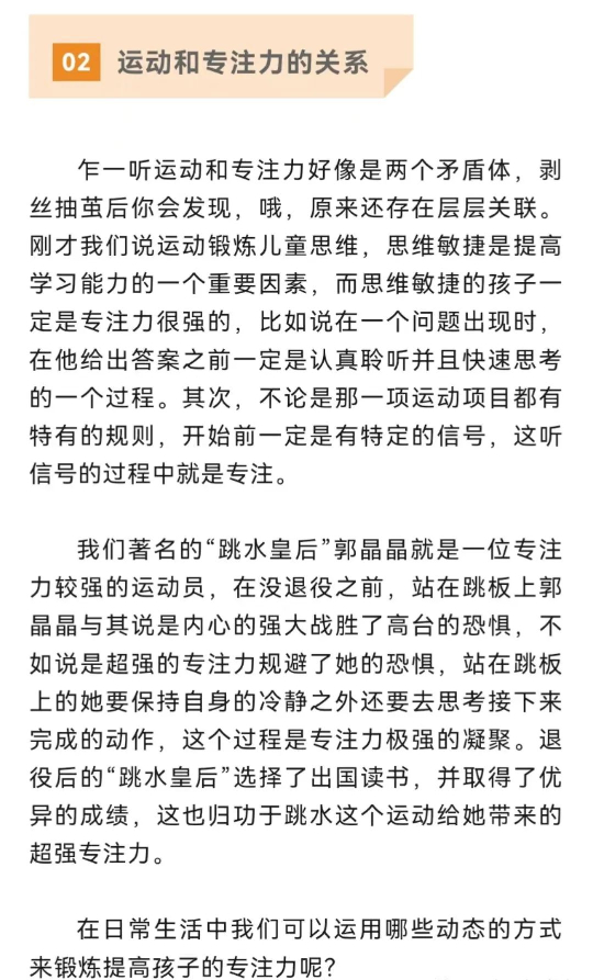 以動制靜策略 制定規(guī)則、明確目標 不論是在家中還是在課堂都可以利用兒童發(fā)展天性,學會用游戲來提高專注力,前提一定要制定可執(zhí)行規(guī)則。比如說聽到書,就要找到與書相關的物體但是不可以拿書;聽到籃球,就要找到與籃球同類的物體但是不可以拿籃球...增強傾聽專注力和思維靈敏。 提高自控、增強執(zhí)行 執(zhí)行力需要自控,而自控需要專注力,抑制內心的沖動,學會冷靜思考。在日常生活中我們可以這樣做,明確分配每一位家庭成員的家務任務,需要在規(guī)定時間內完成,并且由所有家庭成員認可通過后才可以獲得觀看漫畫書或者動畫片的權利。長期養(yǎng)成習慣提高執(zhí)行力,且通過規(guī)則等待提高自控力。 多變引導、刺激興趣 為什么孩子看動畫片、玩游戲可以紋絲不動,可是一寫起作業(yè)就東張西望;玩樂高能玩1小時,看書堅持不了10分鐘?孩子的專注力不夠還有另外一個因素就是興趣,如果孩子對看書不感興趣,再怎么逼都沒有,不光是孩子,成人也是一樣。那我們在日常生活和課堂中可以經常變化玩法,比如減少看電視時間可以一起出去拿快遞;上課坐不住了可以穿插不同小游戲,還可以通過聲音變化、服飾變化引起孩子關注······最終的目的要將孩子的無意注意轉化為有意注意。多變化式引導,尋找孩子的興趣點。 但心理學上,專注力的關聯(lián)還有很多方面,如注意力和認知能力有關,和視覺搜索有關,和情緒有關等等。我們需要多理解和接納孩子。生活因動而有趣,因多變而精彩,注意動靜結合,也要學會以動制靜,不要一昧的壓制打造一個“坐如泰山”的孩子。